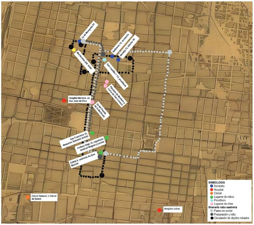 Por medio de la reconstrucción del itinerario urbano de Aurora Coronado y sus coacusados, es posible reconocer una fracción de la geografía de los bajos fondos de la capital mexicana hacia inicios del siglo XX. La cercanía entre los domicilios de cada imputado y la ubicación del prostíbulo del callejón de San Camilito, así como los espacios en que fueron vendidos los objetos robados en la sastrería Au Bon Marché, a los cuales corresponde sumar las referencias periodísticas a la Plazuela de Montero y calles aledañas, permitió establecer que estos escenarios se ubicaban en la colonia Guerrero y el rumbo de la Lagunilla, ambos con fama de barrios turbulentos.