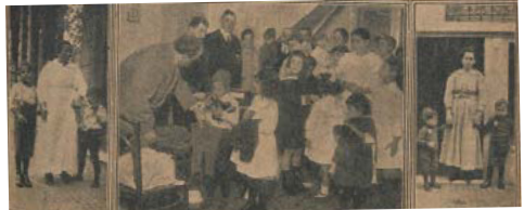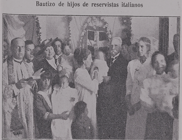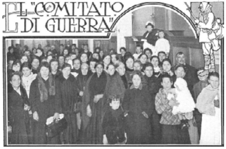 En relativa soledad, esas mujeres hicieron frente a las necesidades materiales y encabezaron los rituales que marcaban el ritmo de la vida familiar. Como documenta la Figura 10 de FM, el fotógrafo de la revista retrató a un grupo de mujeres que sin la presencia de sus esposos habían hecho frente al nacimiento y bautizo de sus hijos. La nota en la que se incluían estas imágenes explicaba que “23 niños recibieron el sacramento del bautismo durante la ausencia de sus padres”, los cuales habían nacido cuando los hombres ya estaban en las trincheras. Del mismo modo, CyC(Figura 11) publicó un artículo dedicado a las mujeres que recibían un subsidio del Comité Italiano de Guerra. Estas asociaciones, como ya mencionamos, dirigidas por inmigrantes se encargaron de solventar las necesidades más elementales de las familias de los que partieron a la guerra. Esto era posible puesto que Argentina contaba con numerosas asociaciones de larga trayectoria que cubrían distintas necesidades de sus paisanos, como salud, educación, sepelio y esparcimiento.36