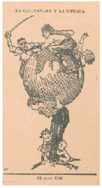 Si usualmente eran las mujeres quienes se hacían cargo del cuidado del hogar y de sus hijos, estas tareas en la coyuntura de la Gran Guerra estuvieron connotadas de cierta heroicidad. Por la patria, que había necesitado de sus ciudadanos, habían quedado solas, no es que hubo una puesta en cuestión del rol materno que como aseveró Nari para la década del veinte “era legitimado” producto de las transformaciones de los años previos, pero sí y de eso no cabe duda es su valorización y visibilización en las vidrieras de los semanarios ilustrados, quienes a través de sus múltiples formas de publicaciones pusieron en primer plano la presencia femenina y materna en el hogar en tiempos de la guerra que habilitó que fueran las jefas del hogar y las encargadas de tomar todas las decisiones diarias. En ese sentido, creemos elocuente traer a colación la caricatura de MA (Figura 12) en la cual se representa a la mujer como “sexo débil.” No obstante, la ilustración claramente contradice la calificación del epígrafe. Esta coloca en primer plano la fuerza femenina que condice con el rol heroico de la mujer en quien recayó el esfuerzo de sostener la guerra desde la retaguardia, no solo en Europa, sino que, también en Argentina con las singularidades del caso.