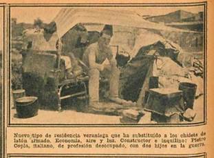 Merece destacar que estas revistas no se limitaron a documentar las dudas y preocupaciones de los jóvenes o adultos. De igual manera, atestiguaron los problemas de aquellos hombres grandes que quedaban sin sus hijos y, por tanto, desprotegidos. Ellos vieron su vida cotidiana totalmente trastocada, como observamos en la fotografía de la revista FM del verano de 1917. La misma retrató en la miseria a un italiano, Pietro Copla. El epígrafe explica que había quedado sin sus dos hijos a causa de la conflagración mundial. Como consecuencia, quedó en la intemperie. Por eso en la nota de la instantánea de la revista aclaraba: “Nuevo tipo de residencia veraniega que ha sustituido a los chalets de cartón armado… italiano, de profesión desocupado, con dos hijos en la guerra.” (Figura 5).