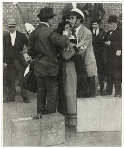 Toda la documentación relevada: los cuadros artísticos, las notas, como las fotografías tomadas por el fotógrafo Prats de la revista el EH, nos acercan a una experiencia de guerra en términos familiares y afectivos. En efecto, en las dársenas del Puerto de Buenos Aires (Figura 7) en lo que fue la partida del séptimo contingente de italianos a la península se observa como una mujer, madre o esposa, lloraba al abrazar a los suyos cuando se disponían a embarcar. El periodista que tomó la foto afirmaba que: “La República Argentina se emociona y llora como una madre adoptiva con la ausencia de las vidas mozas que parten hacia el sacrificio…” En contrapunto, pero para complejizar esta difícil situación, estas revistas publicaron fotografías de lo que sucedió en las naciones europeas con las despedidas de los soldados en las estaciones de los trenes (Figura 8). El epígrafe que acompañó la foto señalaba que: “Un marino inglés despidiéndose, quizá para siempre, de su hijita”.