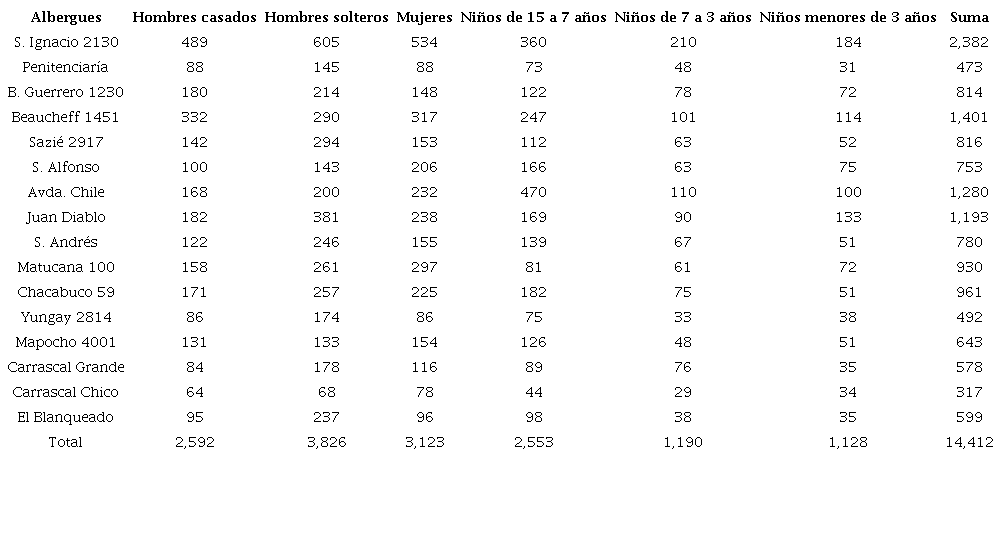 Para el verano de 1922 el Cuerpo de Carabineros envió un cuadro con información referente a la población de dieciséis albergues en Santiago (Tabla 1), cuyo total sumaba poco más de 14 000 personas. No obstante, en una sesión de la Cámara de Diputados se expresó que eran 22 albergues los que habían pasado al control de Carabineros, lo que aumentaría considerablemente el número total de los albergados en la capital.49