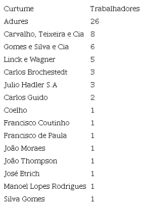 Como apontado anteriormente, Pelotas se destacava nesse tipo de produção, no entanto, há poucas fichas de trabalhadores.25 É certo que havia muitos outros nesses e nos demais curtumes que não constam nos dados, uma vez que esse ramo industrial não prosperaria com poucos trabalhadores. Essa hipótese é verificada a partir das poucas fichas de trabalhadores de dois curtumes: Julio Hadler S.A e Manoel Lopes Rodrigues. Ambos eram estabelecimentos que, nos anos 1920, veiculavam propagandas nos impressos da cidade, com uma linha diversificada de produtos.26 Em outras palavras, havia a necessidade de uma mão de obra superior àquela verificada no acervo. Além disso, talvez, nem sempre o trabalhador necessitava de carteira profissional para ser contratado, desempenhando tarefas na informalidade, o que não era algo exclusivo nesses dois curtumes.