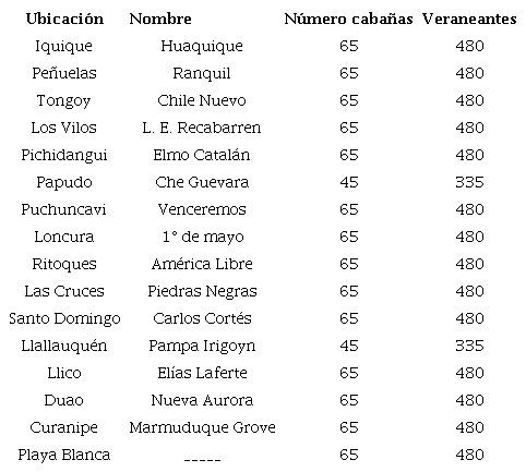 Para el verano de 1972 se puede destacar la inauguración del balneario de Chacarilla en el cerro San Cristóbal del Parque Metropolitano de Santiago, a cargo de la CORMU, el cual disponía de una piscina para 2.000 bañistas que funcionaba de jueves a domingos.51 Además, se inauguraron los balnearios de Curanipe, en la costa de Linares, de Llallauquen cerca del Lago Rapel, provincia de Cachapoal, de Llico en Curicó, de Santo Domingo, provincia de San Antonio, de Puchuncaví y Loncura, sector norte de la provincia de Valparaíso, de Playa Blanca en Lota y el de playa Las Machas en Arica (Tabla 1). Este último, con una piscina, 60 cabinas, tres blocks de servicios higiénicos y un casino52. También se proyectaba la ocupación de playas, tranques y asentamientos campesinos para la construcción de balnearios, para lo cual se debía llegar a acuerdo con la Corporación de Reforma Agraria.