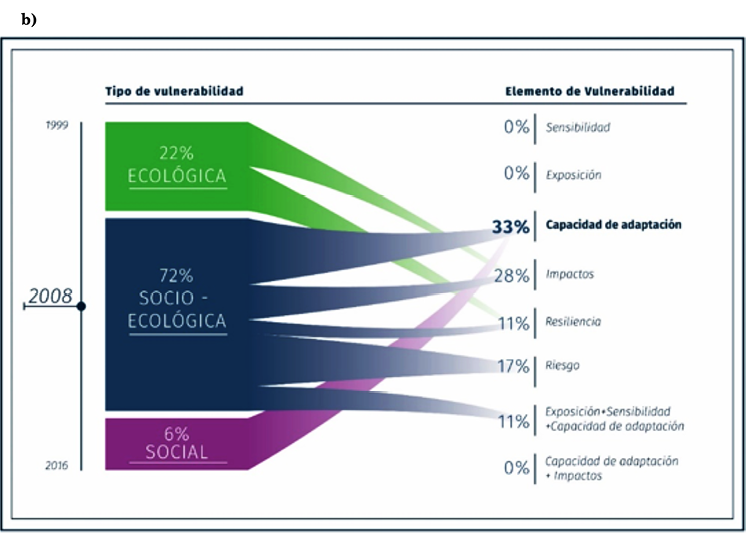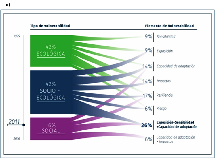 En la Figura 3 se observa el porcentaje de publicaciones relacionadas con los tipos de vulnerabilidad —ecológica, social o socio-ecológica— y el porcentaje del elemento de la vulnerabilidad al que se refieren. En a) se observan los trabajos publicados en revistas indizadas (Anexo i), en donde se observa el mismo porcentaje para los trabajos dirigidos a evaluar la vulnerabilidad ecológica y los de vulnerabilidad socio-ecológica (42%) y 16% de la vulnerabilidad social. En b) a los trabajos publicados en otras fuentes (Anexo ii), la mayoría se enfoca a la vulnerabilidad socio-ecológica (72%), seguidos por los de vulnerabilidad ecológica (22%) y 6% por los de vulnerabilidad social.