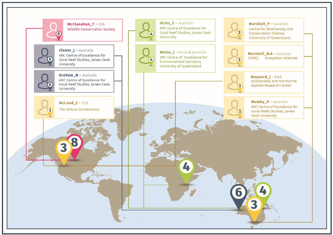 En la Figura 4 se observan los autores con mayor número de publicaciones relacionados con este tema, el país y el sitio de adscripción de cada uno, así como el número de trabajos publicados. Los autores con mayor número de publicaciones en revistas indizadas se encuentran en Australia, excepto tres de ellos que están en Estados Unidos de América. El autor con mayor número de trabajos es McClanahan, adscrito a la asociación civil Sociedad para la Conservación de la Vida Silvestre en los Estados Unidos de América (ocho trabajos), seguido de los investigadores Cinner y Graham, con seis trabajos cada uno y ambos adscritos al Centro de Excelencia de Estudios de Arrecifes de Coral de la Universidad James Cook en Queensland, Australia. En cuanto a las zonas de estudio de las publicaciones en revistas indizadas, la mayoría de ellas se dirigen a Australia, la Gran Barrera de Coral, y Oceanía (30%); le sigue la región del lndo-Pacífico, con 22% y 7% para la región del Caribe.