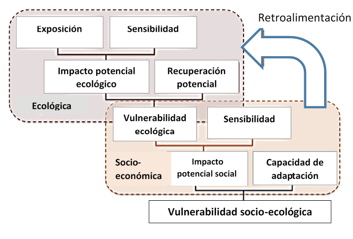 Conceptualmente el modelo más reciente y holístico para evaluar la vulnerabilidad de los arrecifes de coral ante el cambio climático —vulnerabilidad climática— es el de Cinner et al. (2013b) mostrado en la Figura 1. Éste evolucionó del modelo de Marshall et al. (2009) y presenta dos dimensiones: la dimensión ecológica (recuadro café) y la dimensión socioeconómica (recuadro naranja), reconociendo la retroalimentación de ambas dimensiones (flecha azul). En la dimensión ecológica, la exposición y la sensibilidad crean un impacto potencial ecológico; este impacto, junto con la recuperación potencial, representan la vulnerabilidad ecológica; ésta, junto con la sensibilidad social, representan el impacto potencial social y éste, junto con la capacidad de adaptación social, determina la vulnerabilidad socio-ecológica.