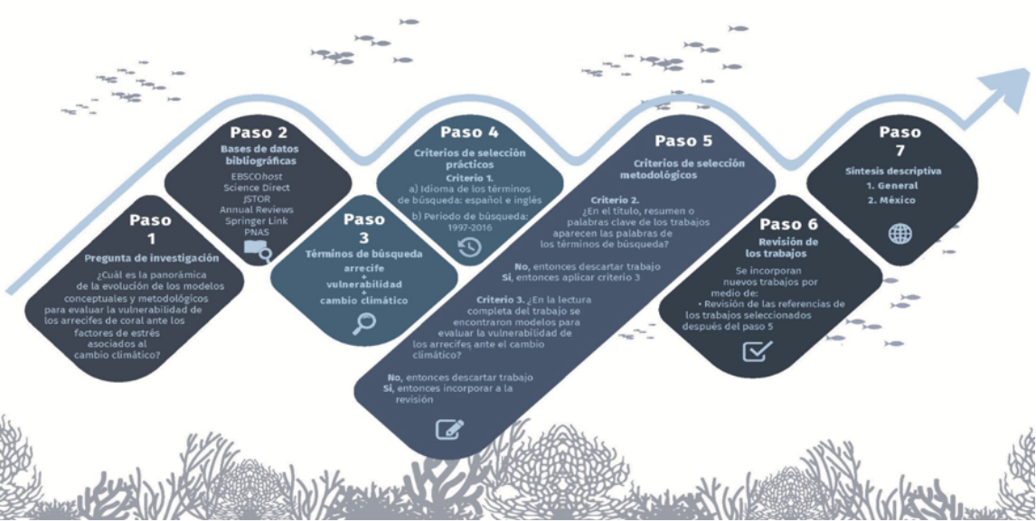 La revisión de la literatura relacionada con los modelos para evaluar la vulnerabilidad climática de los arrecifes se llevó a cabo por medio de la metodología de Fink (2014), quien propone los siguientes siete pasos: Paso 1, seleccionar la pregunta de investigación; Paso 2, seleccionar las bases de datos bibliográficas; Paso 3, seleccionar los términos de búsqueda; Paso 4, aplicar los criterios de selección prácticos; Paso 5, aplicar los criterios de selección metodológicos; Paso 6, realizar la revisión y Paso 7, sintetizar los resultados. En la Figura 2, se observan los pasos de esta metodología seguidos en este trabajo.