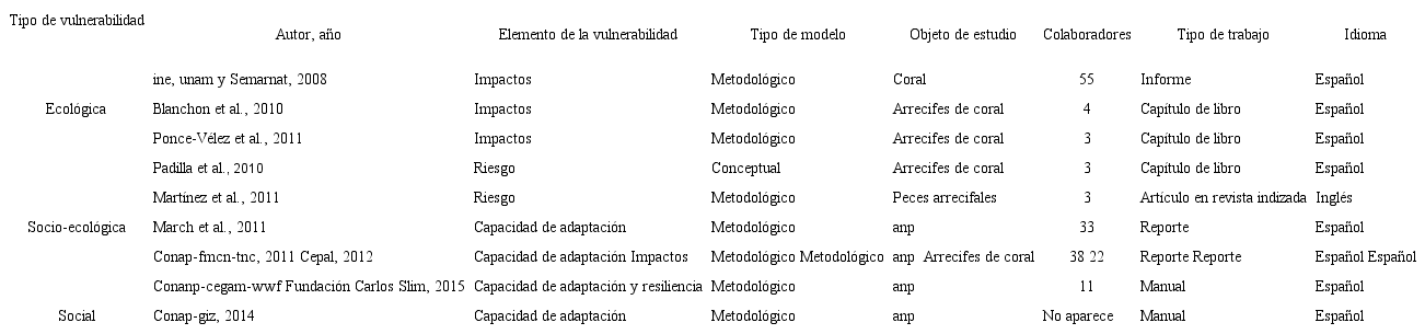 Hay trabajos que tienen como objeto de estudio las anp con modelos metodológicos para evaluar la vulnerabilidad desde la capacidad de adaptación; esto podría estar relacionado con que estas áreas están administradas por la Conap, quien ha tomado la política de adaptación ante el cambio climático global como eje de desarrollo institucional (Semarnat e inecc, 2012); otro motivo podría ser que el Plan Nacional de Desarrollo 2007-2012 incluye como estrategia la evaluación de los impactos, la vulnerabilidad y la adaptación al cambio climático en diferentes sectores socioeconómicos y sistemas ecológicos (Graizbord et al., 2009). Incluso se ha desarrollado una alianza, entre la Conanp y algunas osc que busca recopilar herramientas técnicas, disponibles en línea y de acceso libre, que apoyen en la toma de decisiones y en la implementación de acciones en campo para la adaptación de los ecosistemas y las comunidades al cambio climático, siendo algunas de estas herramientas aplicables para determinar la vulnerabilidad de los arrecifes (March et al., 2013).