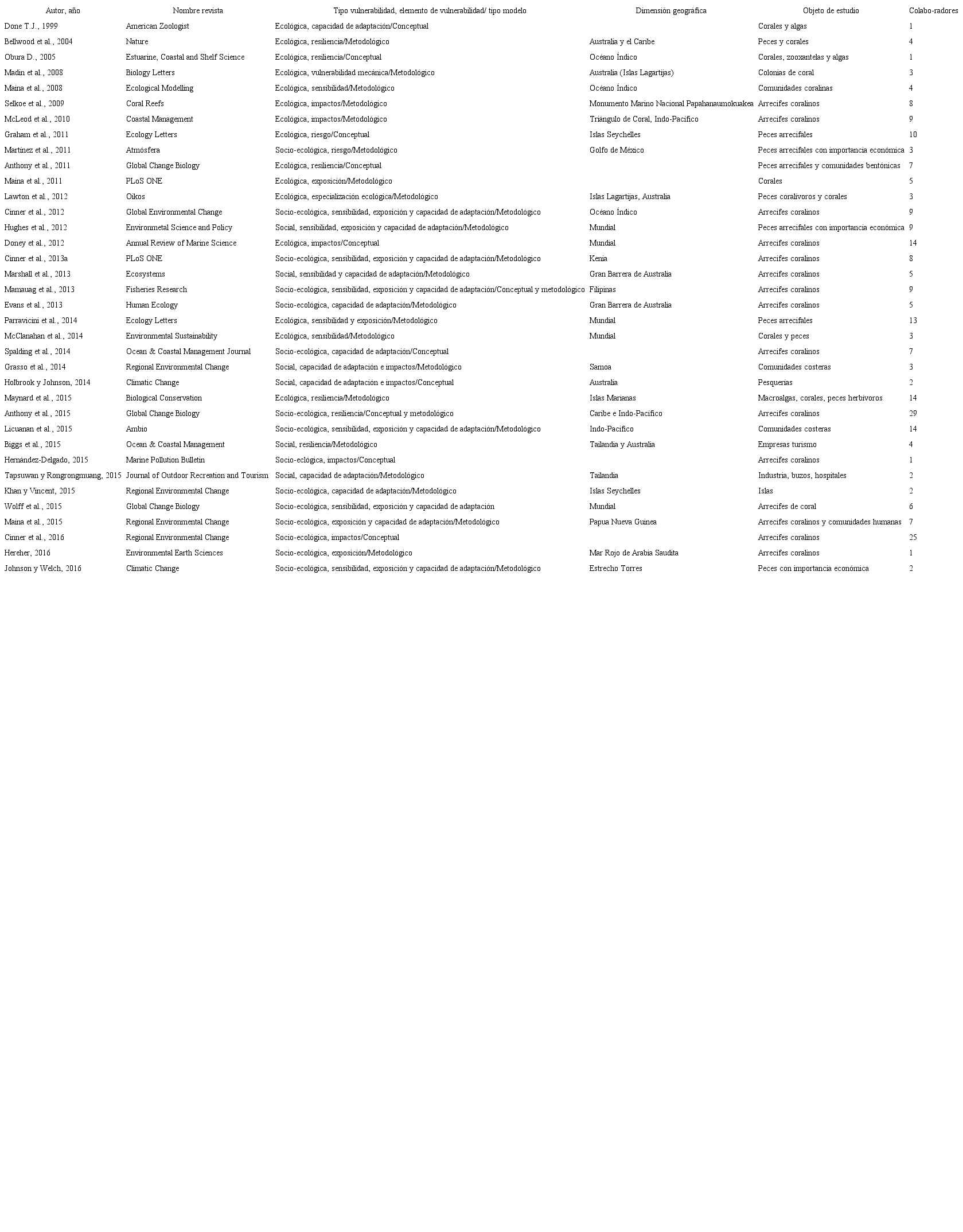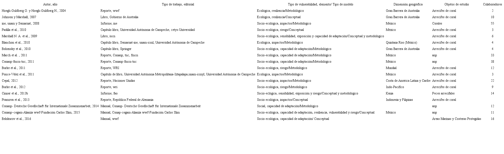 El primer trabajo cuyo objetivo es evaluar la vulnerabilidad climática con sus tres elementos es nuevamente el de Marshall et al., 2009; su definición de vulnerabilidad utilizada está basada en el ipcc y menciona que “la vulnerabilidad está dada en función del tipo, la magnitud y la tasa de variación climática a la que un sistema está expuesto, así como de la sensibilidad y capacidad de adaptación de dicho sistema” (Marshall et al., 2009: 5). A partir de 2012 se observan numerosas publicaciones en revistas indizadas que evalúan los tres elementos de la vulnerabilidad (por ejemplo, Hughes et al., 2012; Johnson y Welch, 2016; Licuanan et al., 2015).