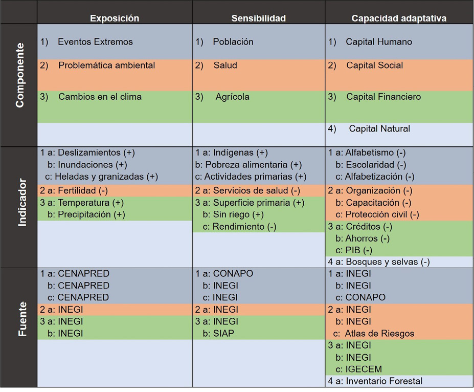 Los indicadores seleccionados fueron de carácter natural, social y económico, los cuales se distribuyeron para cada componente de la vulnerabilidad: exposición, sensibilidad y capacidad de adaptación (Figura 1). Para la selección de indicadores se recurrió a las bases de datos de fuentes oficiales de información como el INEGI (Instituto Nacional de Estadística y Geografía, 2010), el CONEVAL (Consejo Nacional de Evaluación de la Política de Desarrollo Social, 2010), el CONAPO (Consejo Nacional para la Población, 2010), el CENAPRED (Centro Nacional de Prevención de Desastres, 2012), SIAP (2013) y CONAGUA (2013).