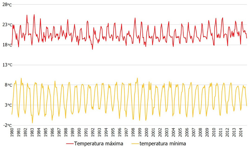 De acuerdo con el análisis longitudinal de temperatura y precipitación, la temperatura máxima promedio para el Distrito se mantuvo entre 19.6 y 20.8 °C, sin embargo, algunos municipios muestran temperaturas de hasta 28 °C, como Temoaya y Lerma. Si bien durante el periodo de estudio no se presentan fluctuaciones significativas, entre 1980 y 1990 se muestra un incremento en este parámetro y posteriormente entre 1990 a 1995 la temperatura máxima desciende llegando a los 16 °C. Por otro lado, la temperatura mínima oscila entre los -2 y 10 °C en promedio, aunque tampoco se presentan cambios significativos entre 1980 y 2014 las temperaturas más bajas se registraron entre 1980 y 1985, mientras que las bajas más altas se presentan a partir del año 2000 alcanzando como mínima los 10 °C como se aprecia en la Figura 2, donde el eje vertical corresponde a los grados centígrados y el eje horizontal al periodo de estudio.