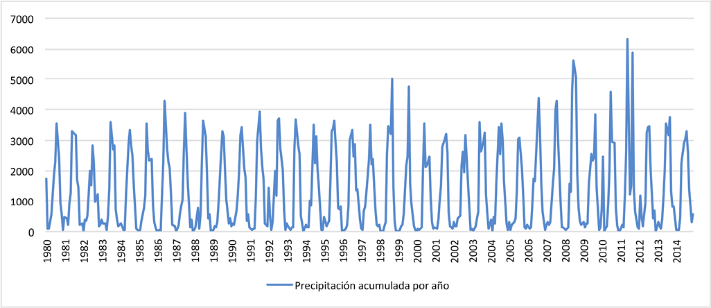 En el DDR-Toluca se presentan precipitaciones que van de los 680 a los 1 070 mm en promedio anual. Los meses más húmedos van de abril a julio y los más secos de octubre a febrero. De acuerdo con los datos de las estaciones la precipitación ha presentado variación en cuanto a tiempo y espacio. A partir del año 2006 se observa un incremento en dicho parámetro presentando valores anuales de cerca de los 1 000 mm, como se muestra en la Figura 3 en la que el eje vertical corresponde a la cantidad de lluvia acumulada para el Distrito en milímetros y el eje horizontal corresponde al periodo de estudio.