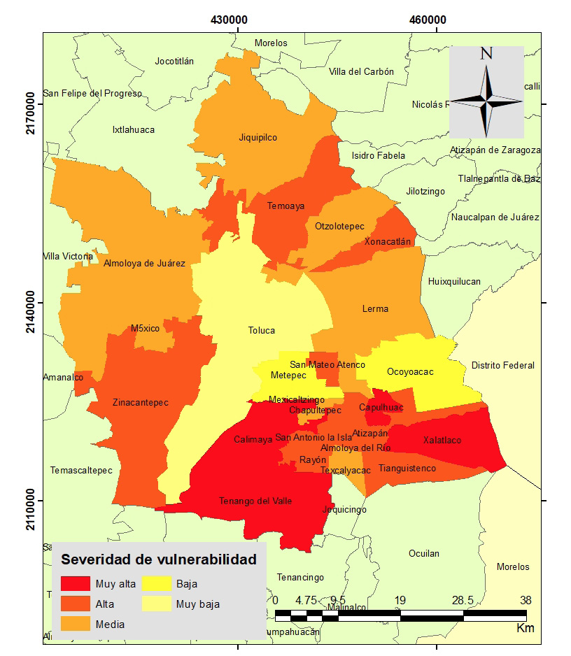La severidad de la vulnerabilidad se estableció a través de los valores obtenidos de los subíndices de exposición, sensibilidad y capacidad de adaptación, considerando que a mayor exposición y sensibilidad mayor será la vulnerabilidad, al contrario de la capacidad de adaptación que cuando presenta valores más altos disminuye la condición de ésta. Una vez aplicada la ecuación 6 y se integraron los valores de exposición, sensibilidad y capacidad adaptativa se calculó la severidad de la vulnerabilidad para cada municipio, en este sentido los valores que van de 0 a 25 presentan una baja vulnerabilidad como es el caso de Metepec, Ocoyoacac y Toluca; de 26 a 50 se presenta una mediana vulnerabilidad en los municipios de Almoloya de Juárez, Chapultepec, Jiquipilco, Lerma y Texcalyacac; de 51 a 75 se considera una alta vulnerabilidad en los municipios de Almoloya del Río, Atizapán, Otzolotepec, Rayón, San Antonio la Isla, San Mateo Atenco, Temoaya, Tianguistenco, Xonacatlán y Zinacantepec; finalmente los valores de 76 a 100 muestran condiciones muy altas de vulnerabilidad, como es el caso de Calimaya, Capulhuac, Xalatlaco, Mexicaltzingo y Tenango del Valle (figura 5). De acuerdo con lo anterior, de los 24 municipios, 15 presentan una alta vulnerabilidad, —el 62% de la zona— debido principalmente a las condiciones socioeconómicas y naturales, mientras que 16% se encuentra en un grado de baja vulnerabilidad.