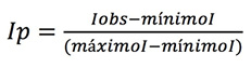 Donde I representa el subíndice de la variable P, Iobs es el valor del subíndice para cada municipio, mínimoI es el valor mínimo observado del conjunto de valores de Ip y máximoI es el valor máximo observado del mismo conjunto de valores I.