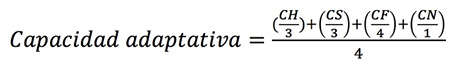 Para estimar los subíndices de exposición, sensibilidad y capacidad adaptativa se asignaron los mismos pesos a cada variable a través de una media aritmética y el cálculo de cada subíndice se realizó de la misma manera con los datos estandarizados y normalizados. La exposición se midió a través de la Ecuación 3, la sensibilidad se midió a través de la Ecuación 4 y la capacidad de adaptación se midió con la Ecuación 5.