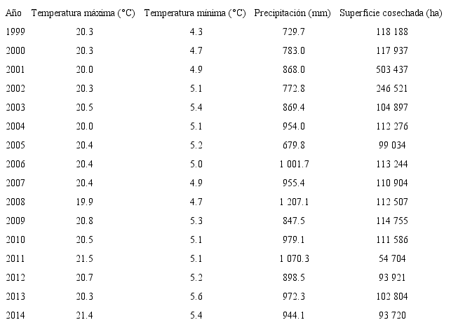 El cambio climático es uno de los principales retos a los que se enfrenta la humanidad actualmente. Dicho fenómeno implica un problema de carácter global con consecuencias regionales afectado por sistemas naturales y antropogénicos. Una de las principales causas de este proceso es la concentración de gases de efecto invernadero por causas naturales y antropogénicas principalmente (ipcc, 2007; Monterroso, 2012). Estos cambios han impactado y modificado el entorno natural generando desequilibrio en los ecosistemas y recursos naturales que implican, a su vez, alteraciones en los sistemas humanos tanto en la esfera social como económica. Derivado de ello ha aumentado la preocupación por la situación actual y futura de este fenómeno, se han creado iniciativas sociales, políticas y científicas para actuar ante esto. Estudios recientes muestran incrementos significativos en la temperatura, aumentos en las anomalías climáticas y alteraciones en el régimen hídrico (Barbero et al., 2008). Estas variaciones en el clima han impactado diferentes sistemas productivos como es el caso de la agricultura. Esta actividad es altamente sensible a los cambios climáticos, cualquier cambio en la temperatura y precipitación altera su producción, lo cual representa un riesgo para la economía y la seguridad alimentaria de la población (Conde, 2006; Tao et al., 2011).