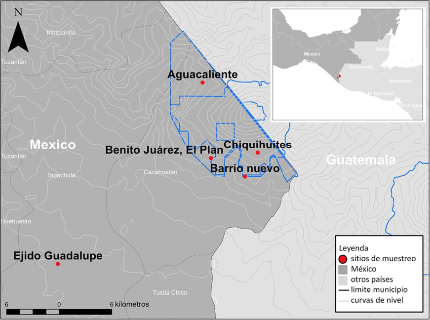 La investigación de campo se llevó a cabo en cinco comunidades del Soconusco, cuatro dentro de la Reserva de la Biosfera Volcán Tacaná y una en el municipio de Tapachula (Figura 1).
