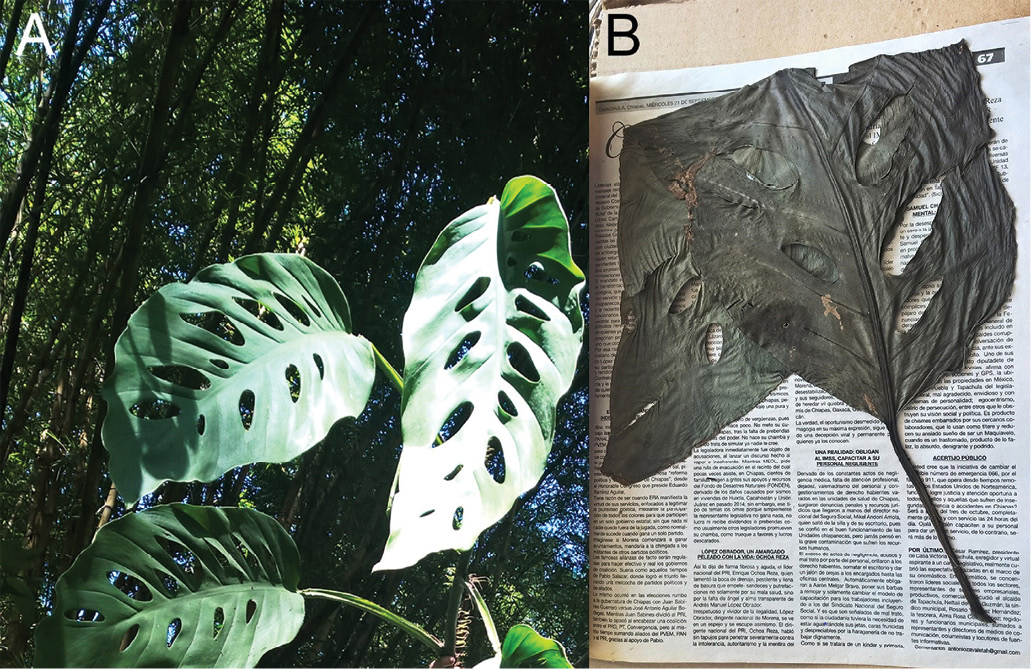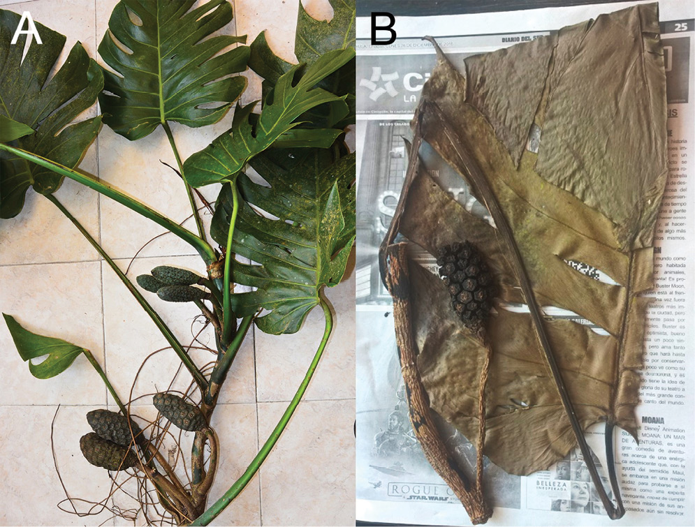 Se colectaron cuatro morfotipos por especie útil para la identificación taxonómica, con el número de permiso de colecta (SGPA/DGVS/04089), autorizado por la Secretaría de Medio Ambiente y Recursos Naturales (Semarnat). Las colectas se depositaron en el herbario de Ecosur, unidad Tapachula (eco-tap-h), según los protocolos vigentes (Leisner, 1997) (para M. acuminata, números de colecta 193, 194, 195,; para M. deliciosa, número de colecta 197; en ambos casos, colector V. Bertolini). El proceso de clasificación y determinación taxonómica se llevó a cabo en el herbario de Ecosur, unidad Tapachula. La identificación taxonómica fue corroborada por el Dr. Thomas B. Croat, especialista en taxonomía de aráceas del Jardín Botánico Missouri, St. Louis, Estados Unidos