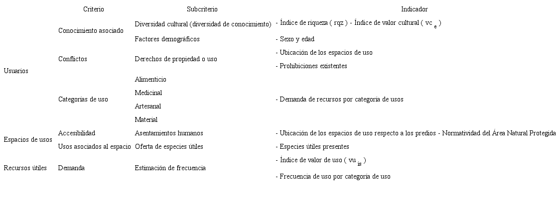 El análisis cuantitativo se llevó a cabo con el Sistema de Uso de Biodiversidad (subd) (Castellanos-Camacho, 2011), que conjuga los sistemas culturales y la biodiversidad, un producto directo de los procesos de transformación de la biodiversidad y de la diversidad cultural de una población. Se calcularon los índices de riqueza (rqz), de valor de uso (vuis) y de valor cultural (vce) (Cunningham, 2001; Toscano, 2006) (Cuadro 1).