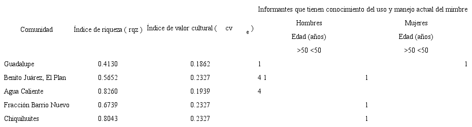 Los informantes de las comunidades Benito Juárez, El Plan, Fracción Barrio Nuevo y Chiquihuites les asignaron valor cultural a más especies útiles que los de Agua Caliente y Guadalupe, como se observa en el Cuadro 2. Los informantes mayores de 50 años tienen más amplio conocimiento local sobre el uso y elaboración del mimbre. Estos informantes fueron en total 36: 22 hombres y 14 mujeres; de éstos sólo 9 hombres (40%) y 3 mujeres (21.42%) tienen conocimiento actual y pasado del uso y manejo del mimbre (Cuadro 2).