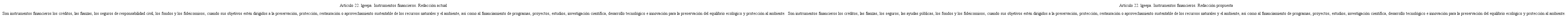 Son instrumentos financieros los créditos, las fianzas, los seguros de responsabilidad civil, los fondos y los fideicomisos, cuando sus objetivos estén dirigidos a la preservación, protección, restauración o aprovechamiento sustentable de los recursos naturales y el ambiente, así como al financiamiento de programas, proyectos, estudios, investigación científica, desarrollo tecnológico e innovación para la preservación del equilibrio ecológico y protección al ambiente (art. 22).