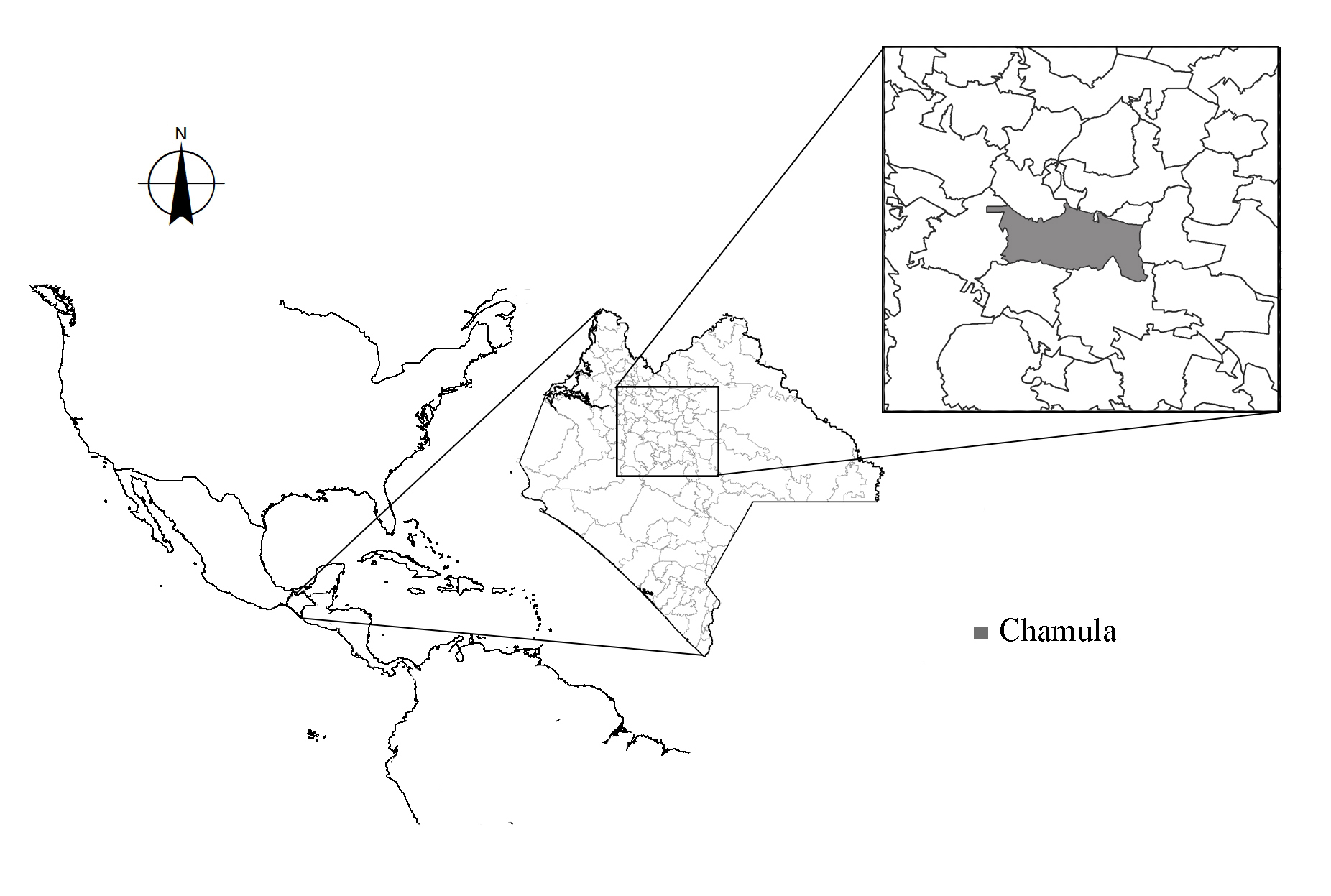 El municipio de San Juan Chamula se encuentra en la región de los Altos de Chiapas en la parte central del estado. Cubre 345 665 km2 en la latitud 16º 47’ norte y la longitud de 92º 41’ oeste, con una altitud promedio de 2 260 m s.n.m. (Figura 1). El clima predominante es templado subhúmedo C(w2). La vegetación consiste en bosques templados con pino (Pinus ayacahuite, P. montezumae, P. pseudostrobus, P. tecunumanii y P. oocarpa) y encino (Quercus crassifolia, Q. crispipilis, Q. laurina y Q. rugosa) (inafed, 2005; Martínez-Icó et al., 2015). La población estimada es de 87 332 personas (inegi, 2015) hablantes de tsotsil. En este municipio las actividades económicas primarias son de gran importancia, en segundo lugar se encuentran actividades asociadas al comercio y turismo.