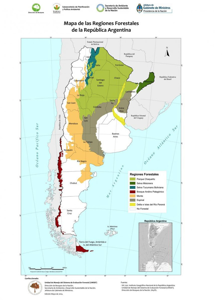 El criterio de ecorregiones divide el territorio de acuerdo a los espacios homogéneos que presentan características propias del relieve, clima, hidrografía, vegetación y fauna, entre otros aspectos como son también los culturales. Ha sido el mismo que se ha aplicado en la elaboración de un mapa de bosques nativos, donde cada región posee características particulares (Figura 1).
