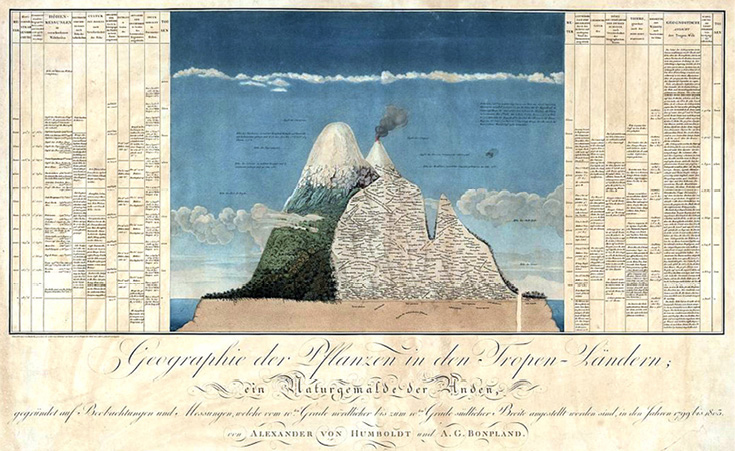 Llegaron a Cuba, a principios del año 1801, con la idea de seguir a México, pero al enterarse que dos barcos franceses estaban en ruta para circunnavegar el mundo, Humboldt pensó que podría alcanzarlos en Lima, a donde calculó llegarían a fines de año. El plan era atractivo porque podría visitar Bogotá, conocer a José Celestino Mutis, un botánico reconocido, y cruzar los Andes. Llegaron a Quito en enero de 1802 para enterarse que el plan de la expedición francesa era voltear por el Cabo de Buena Esperanza, por lo que no habría forma de coincidir en América. La ventaja de estar en Ecuador era visitar El Chimborazo, una de las montañas más altas conocidas, ubicada a unos 160 km de Quito. La ruta hacia el volcán extinto iba desde los trópicos hasta la vegetación alpina, por lo que Humboldt concluyó que semejaba un viaje hacia los polos, con la vegetación en estratos sucesivos. La serie de observaciones y mediciones le permitió generar el Naturgemälde, aquí reproducido, cuya traducción literal sería La pintura de la naturaleza, pero que implica “un sentido de unidad o de totalidad”. La síntesis gráfica no tenía precedente y, dicho sea de paso, se usó recientemente como evidencia adicional del impacto del calentamiento global (http://www.pnas.org/cgi/doi/10.1073/pnas.1509938112).