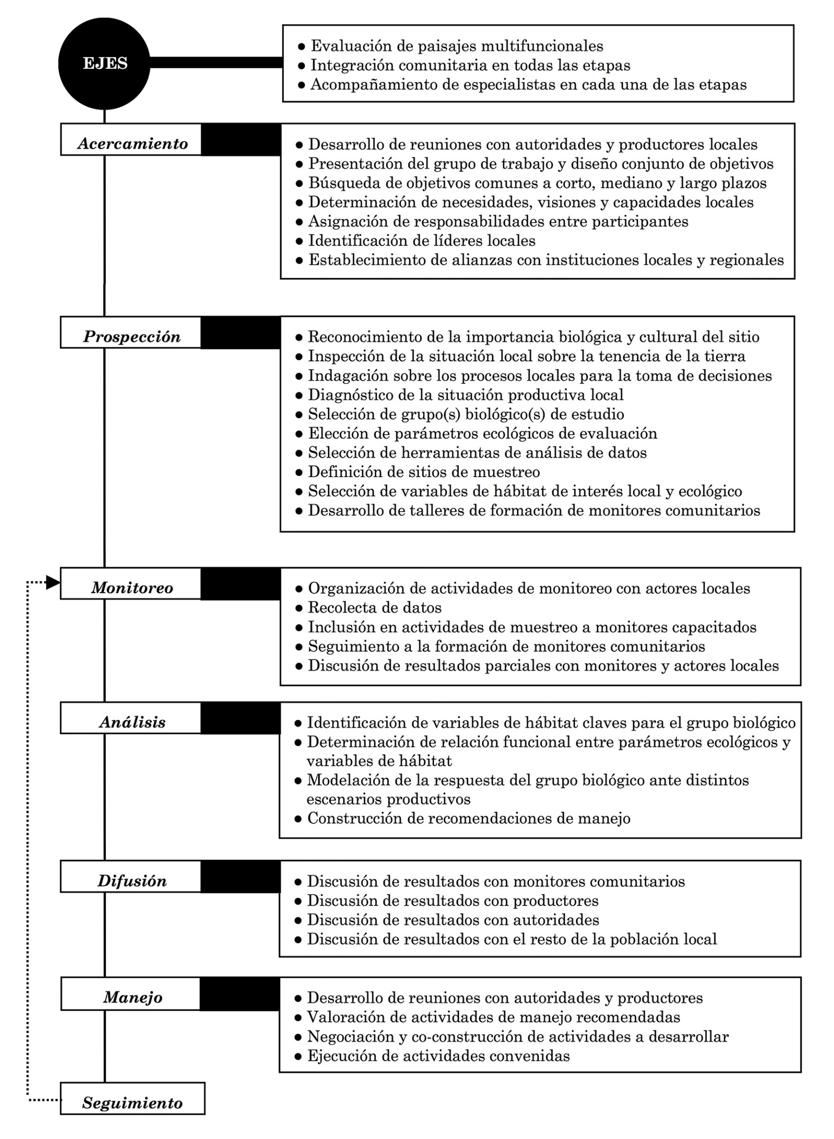 Tres ejes soportan el desarrollo del esquema, mismos que deberán ser considerados en todas sus etapas: su inserción en paisajes multifuncionales, la integración comunitaria y el acompañamiento de especialistas. La etapa de “Acercamiento” es crítica, pues sienta las bases sociales que sustentarán el desarrollo de pautas de manejo. Por su parte, durante la etapa de “Prospección” lo que se busca es definir el desarrollo de las evaluaciones ecológicas, para lo cual es deseable que la selección del grupo biológico a evaluar se realice considerando su facilidad de muestreo, su importancia ecológica y su relevancia cultural. La selección de variables de hábitat debe sujetarse al contexto local, de tal forma que se consideren aquellas características relevantes para las prácticas productivas analizadas, su factibilidad de manejo comunitario, su relevancia social y su importancia ecológica. La etapa de “Monitoreo” incluye la recopilación de datos.