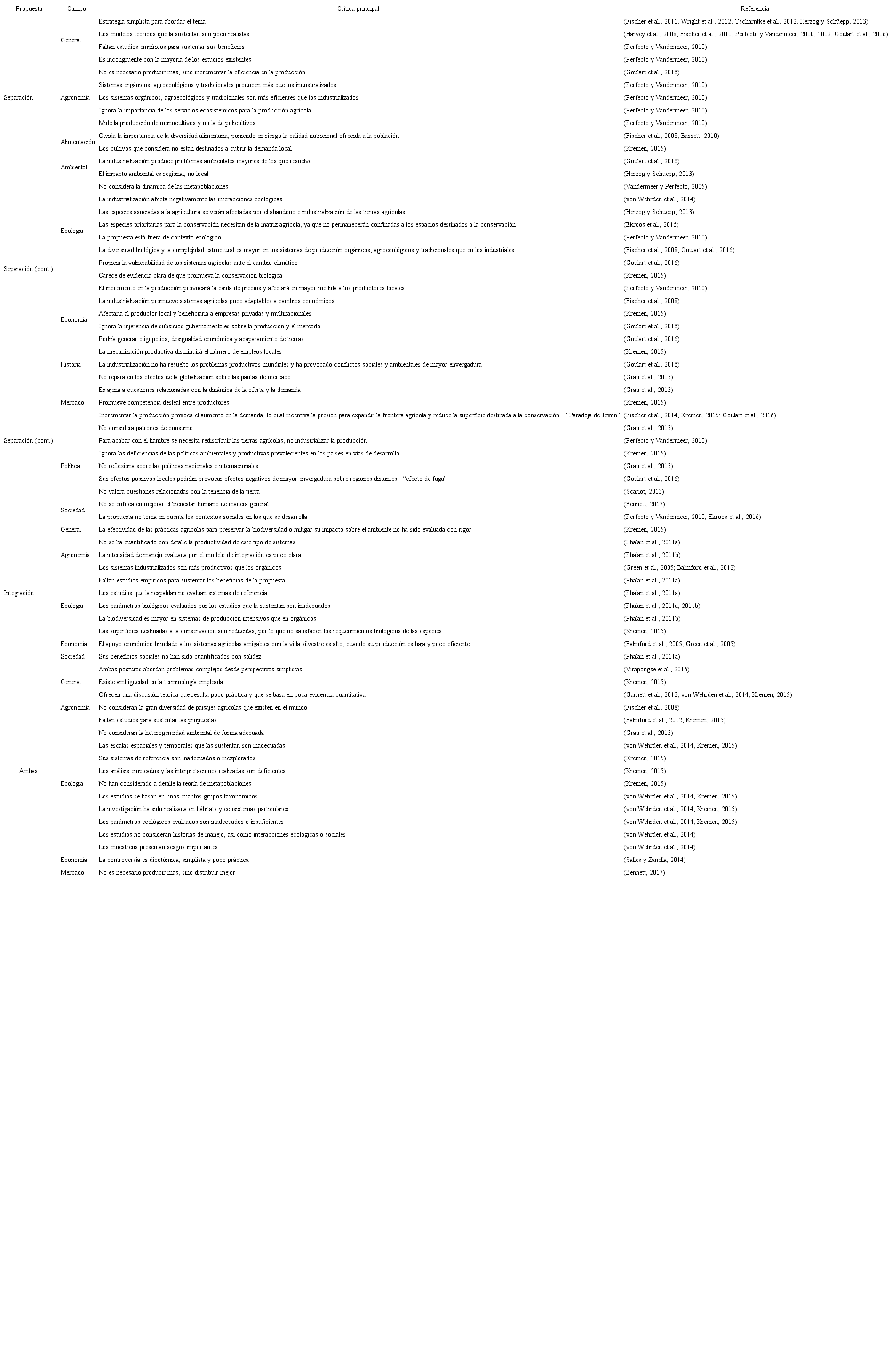 El debate entre los modelos de separación e integración territorial parte del dilema de cómo incrementar sostenidamente la producción agrícola, pecuaria y forestal, a la par de conservar —e incluso recuperar— la biodiversidad y los ecosistemas deteriorados o perdidos en los últimos siglos de actividad humana. Este debate ha recibido mucha atención, particularmente en la última década. Existen trabajos excelentes que revisan desde la perspectiva ecológica (Grau et al., 2013; Kremen, 2015; Goulart et al., 2016), económica (Goulart et al., 2016), política (Grau et al., 2013; Kremen, 2015), social (Kremen, 2015) y de uso de suelo (von Wehrden et al., 2014) las posibles ventajas y limitantes de ambos modelos. Tomando en cuenta las revisiones anteriores, así como los trabajos que han abordado el tema, en el Cuadro 1 se compilan las principales críticas que se consideran clave para comprender y abordar el debate.