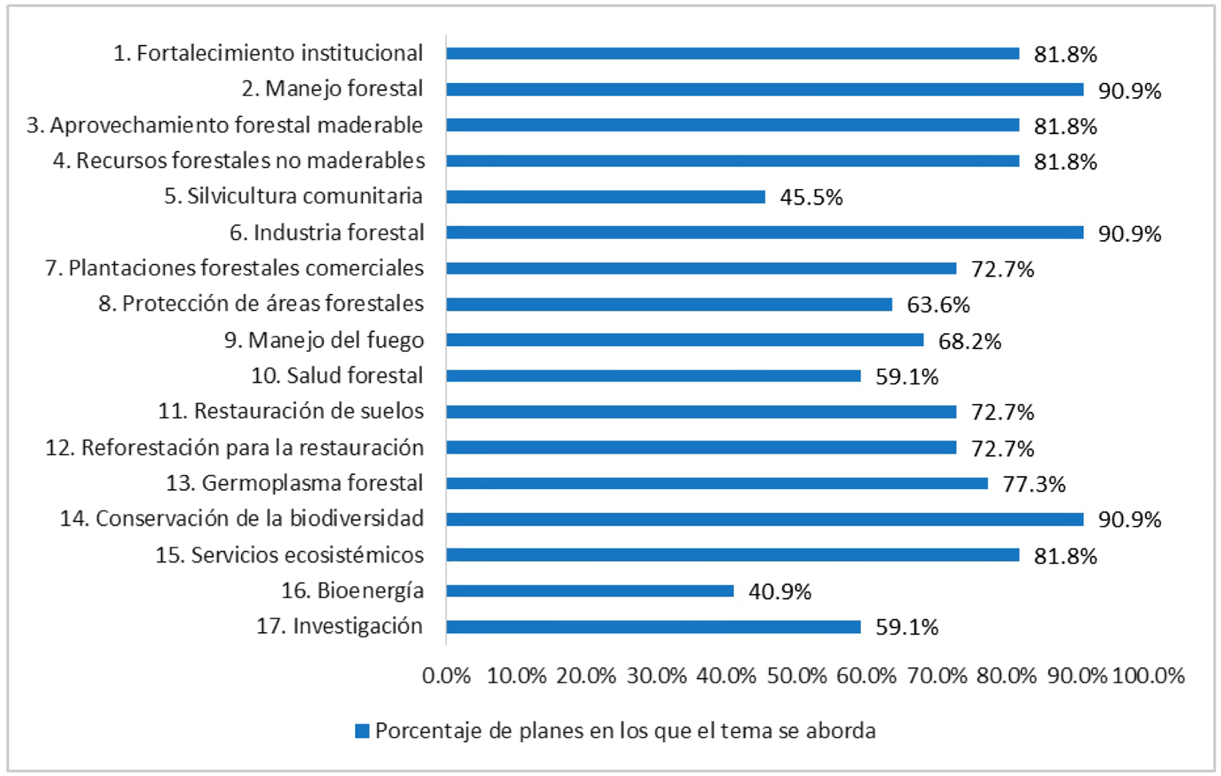 En la mayoría de los planes del sector forestal en el nivel subnacional se menciona la participación de los dueños y poseedores de las áreas forestales, pero no se especifica información clave para su caracterización, entre otras: el número de participantes, los criterios bajo los cuales fueron invitados a contribuir en la elaboración del plan, o su nivel de desarrollo tecnológico en las actividades productivas. Los principales temas abordados en los planes del sector forestal de mediano plazo en el nivel subnacional fueron la conservación de la biodiversidad, el manejo forestal y el fortalecimiento de la industria forestal. En menos de la mitad de los planes se propusieron estrategias relacionadas con el fortalecimiento de la silvicultura comunitaria.