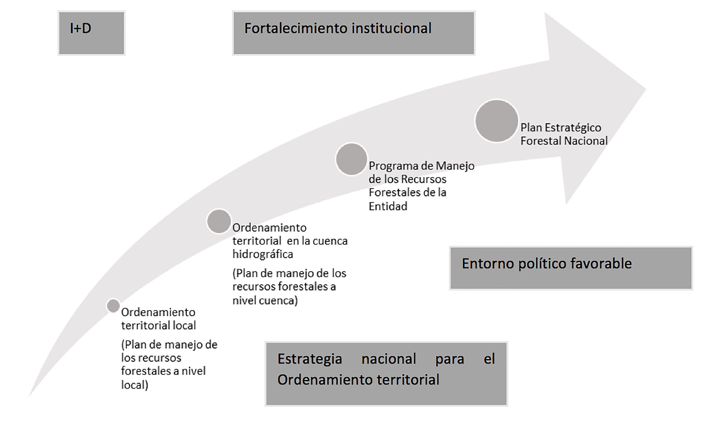 La instrumentación de una estrategia como la que aquí se plantea debe considerar que paralelamente se trabaje en fortalecer las instituciones para así favorecer la gobernabilidad de las áreas forestales. Se trata de una estrategia nacional de asesoría técnica para el sector rural en las áreas forestales, abierta a la generación de propuestas para la diversificación de actividades, el ordenamiento territorial y el desarrollo de la investigación, la ciencia y la tecnología, orientada además a mejorar los sistemas de producción, transformación y comercialización de los bienes y servicios forestales. Los mecanismos de trabajo en el proceso de planificación participativa a nivel local deben adaptarse a las características específicas de los productores en consideración de sus niveles de organización, capital social y autonomía, así como las regulaciones internas para el acceso y uso de los recursos forestales, los recursos de uso cotidiano, sus actividades de producción, ya sea de autoconsumo o comercial, y sus condiciones de acceso al mercado.
