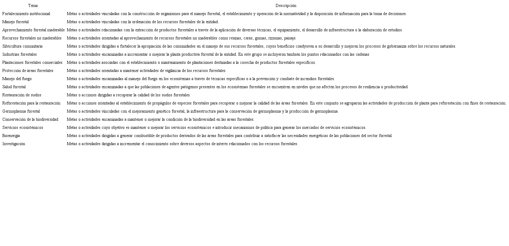 Otro aspecto de interés para este análisis fue determinar sobre qué tópicos de la administración forestal se planteó obtener resultados en los programas de las diferentes entidades. Para ello, las metas fueron clasificadas de acuerdo con los criterios que se presentan en el Cuadro 1.