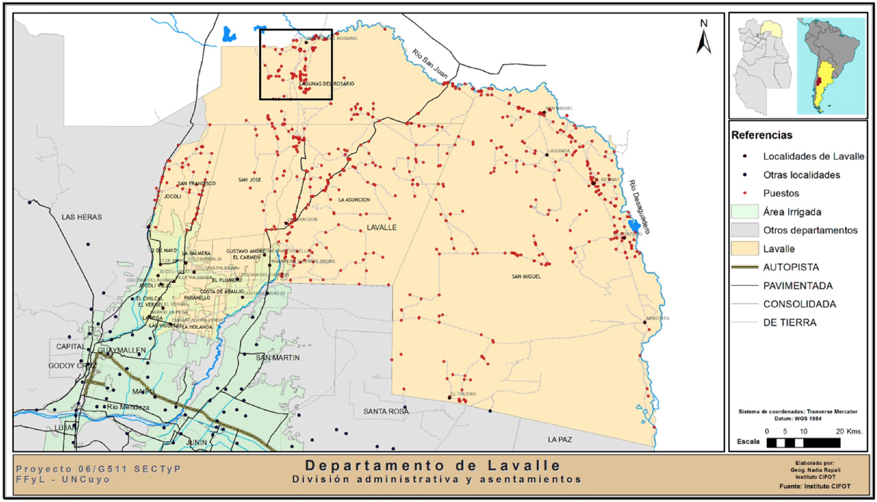 Se utilizaron métodos cualitativos: la observación directa y entrevistas semiestructuradas para la construcción de datos a partir de un caso de estudio. De acuerdo con el problema de investigación se seleccionó como caso el distrito de Lagunas del Rosario, emplazado en el departamento de Lavalle, en el noreste provincial. Este territorio se encuentra habitado históricamente por una comunidad indígena Huarpe. A su vez, el sitio presenta grandes transformaciones territoriales acontecidas, en gran parte, por su localización periférica respecto al oasis norte —principal zona irrigada en la provincia de Mendoza— y desde la relación histórica entre zonas no irrigadas y oasis, lo que implicó también un abordaje multiescala. En cuanto al ecosistema natural, el sitio se emplaza en el árido mendocino sometido a fuertes procesos de desertificación que inciden en las actividades productivas de subsistencia que despliegan los pobladores.