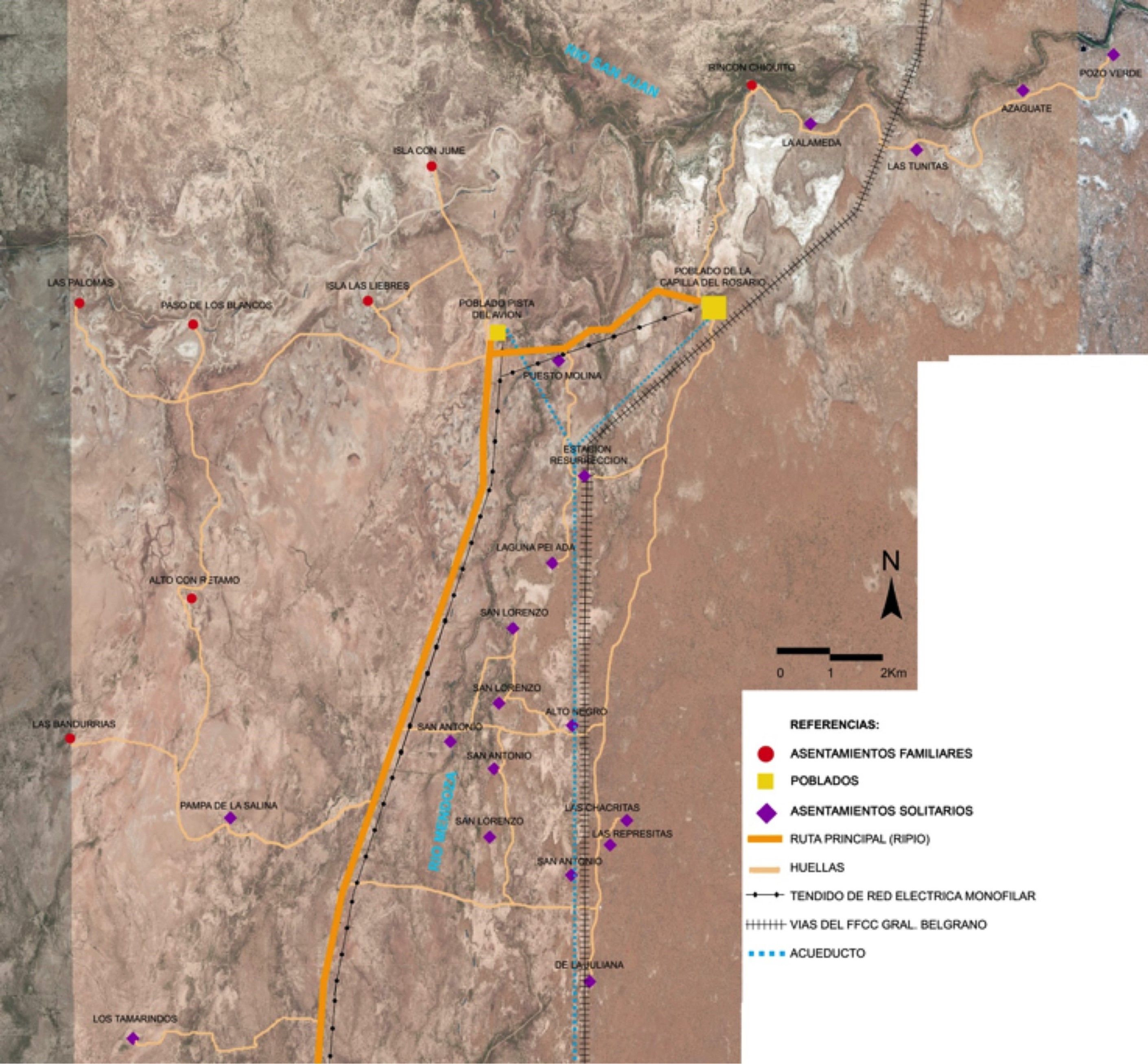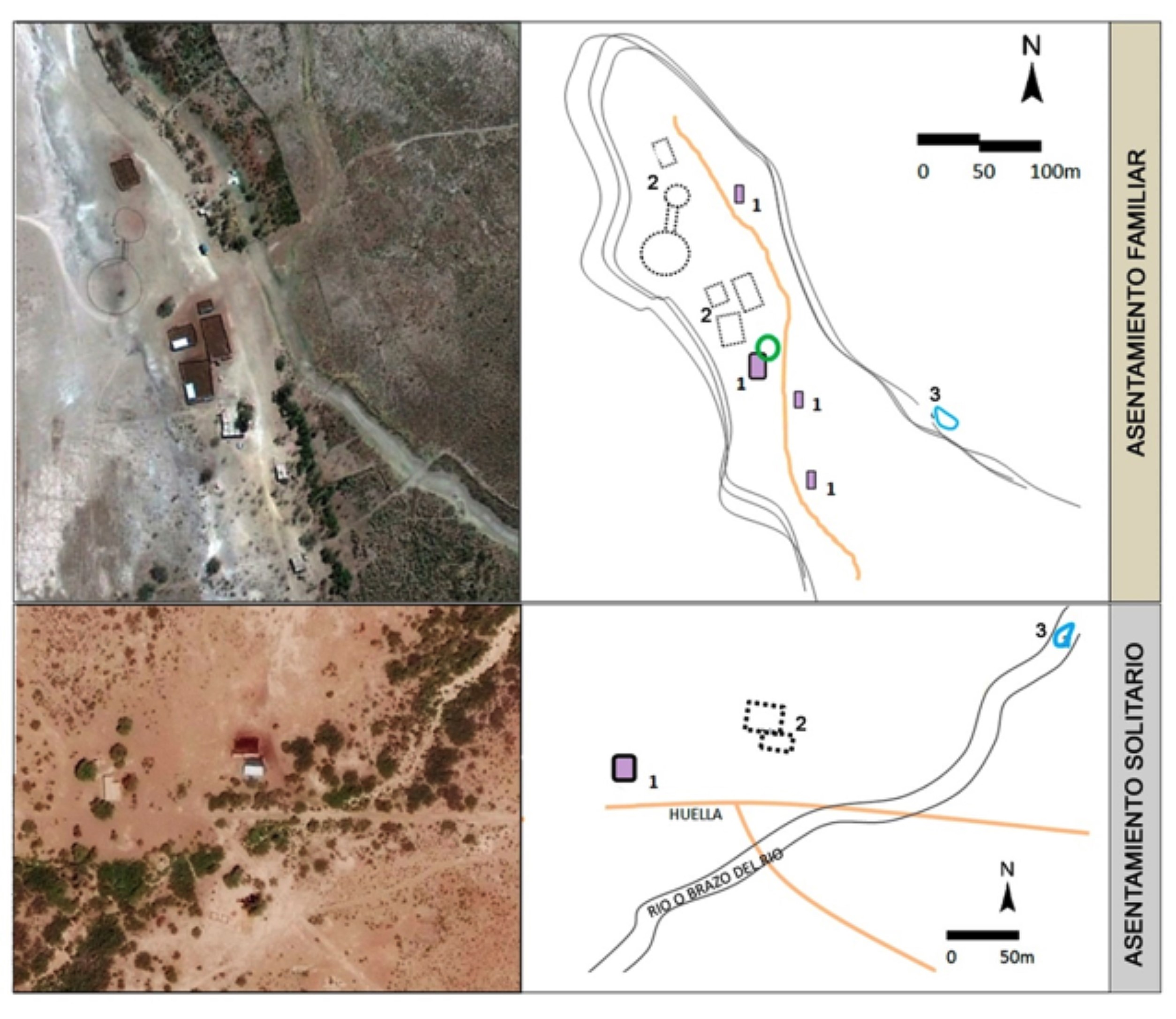 Estos asentamientos familiares se encuentran alejados de sus vecinos a una distancia que oscila entre los 2.5 km a 7 km y por lo tanto, la disponibilidad de mano de obra al interior del predio es clave para el desarrollo de las actividades productivas y la vida diaria, resaltando la estrategia de agrupamiento familiar. En contraposición, los asentamientos solitarios presentan mano de obra limitada a esa única familia aunque la proximidad a los vecinos (entre 0.7 km a 4 km de distancia) propicia relaciones de reciprocidad en diversas situaciones (Figura 2). En ambos casos, se emplazan sobre antiguos cauces de agua o en los costados de los ríos secos, ya que se trata de ubicaciones estratégicas para aprovechar la esporádica presencia de agua de lluvia o bien acceder al agua subterránea a menor profundidad.