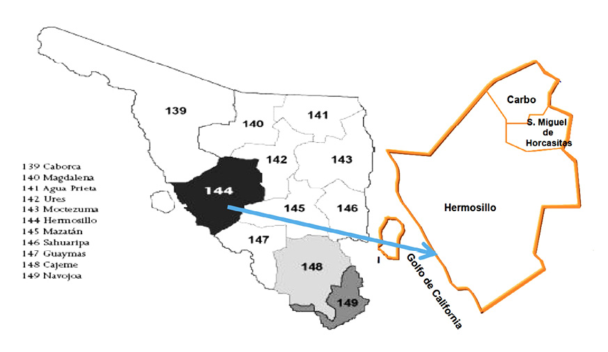 Las localidades agrícolas del DDR 144 se concentran en Hermosillo y San Miguel de Horcasitas, conjuntan el 89.5% de la superficie y el 98.9% de su población (Figura 1).