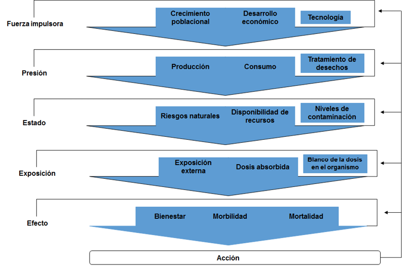 El modelo contempla dos etapas (diagnóstico y acción), cada una con cinco fases. En la primera etapa se describen las fuerzas impulsoras o determinantes del desarrollo económico de la región y su dinámica poblacional (primera fase); después los factores que ejercen presión sobre los procesos de producción y consumo de la región (segunda fase); el estado o calidad ambiental de la región, los riesgos ambientales existentes y la disponibilidad de recursos naturales (tercera fase) y su posible interacción con los factores descritos en las fases previas; posteriormente, los niveles de exposición o posibles dosis de contaminantes absorbidas por el ambiente (agua, suelo, aire) y se documenta la potencial situación de exposición externa a contaminantes en relación con las prácticas productivas identificadas y las condiciones ecosistémicas de la región (cuarta fase); finalmente, se describe los efectos en la situación de salud de la población vía la revisión de aspectos de bienestar, morbilidad y mortalidad, así como las tendencias históricas en relación con las actividades económicas identificadas como fuerzas impulsoras (quinta fase). La etapa acción refiere a esbozar las acciones posibles de instrumentar en relación con los elementos problemáticos destacados en el diagnóstico previo. Puede adoptar una variedad de formas que van desde el desarrollo de políticas o técnicas de control a partir de indicadores, hasta acciones de educación ambiental y/o el tratamiento de enfermedades (Waheed et al., 2009).