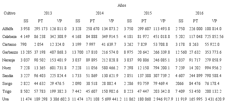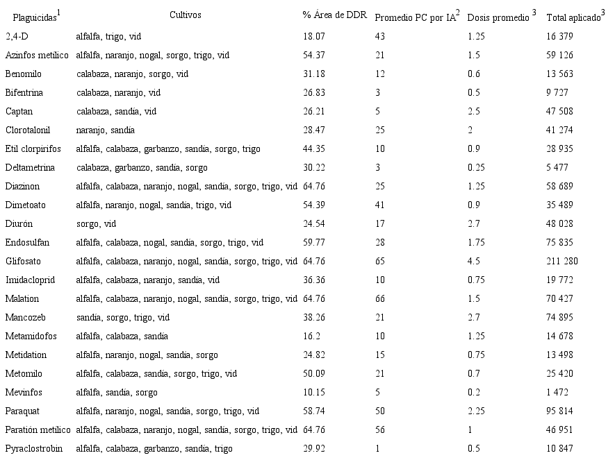 El cambio en el patrón de cultivos en el DDR 144 va de la mano de altos valores de producción, ocupando el primer lugar en este rubro a nivel estatal al generar 40 345 millones de pesos, el 30% por la uva, nogal, cítricos y hortalizas (SIAP, 2018). Los cultivos más sobresalientes del 2013 al 2016 en superficie sembrada fueron garbanzo, nuez, trigo y uva; en producción por hectárea destacaron sandía, alfalfa, uva y calabaza; y en valor monetario la uva, nuez, hortalizas y garbanzo (Tabla 1). Tan altos niveles de producción se sustentan en el uso de varios insumos, plaguicidas en particular.