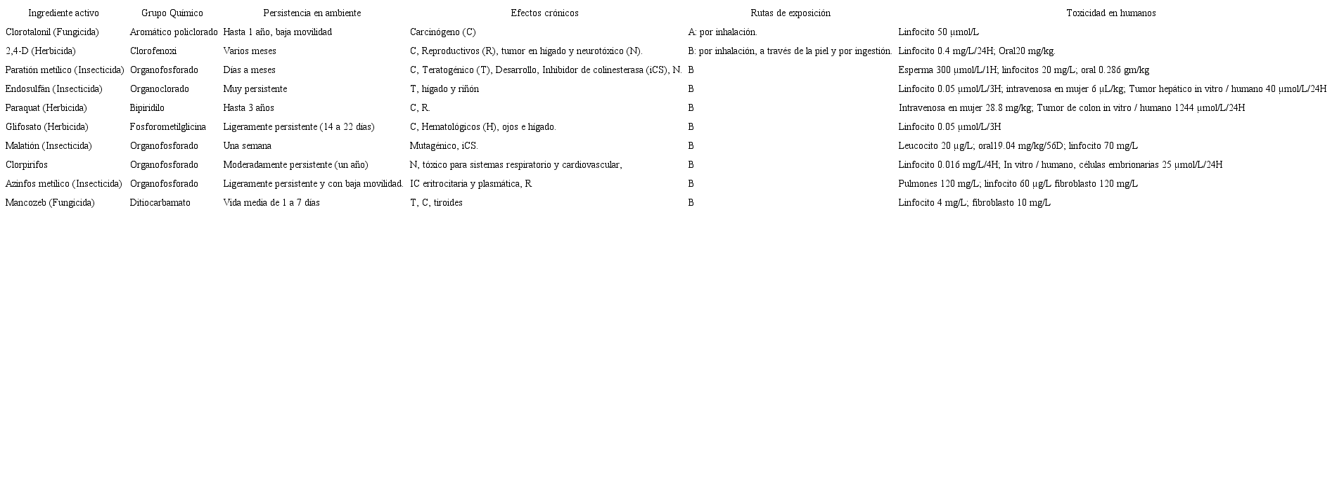 En lo ambiental, a pesar de la poca información disponible respecto al uso de plaguicidas, se sabe que en México están autorizados 183 ingredientes activos (IA) de Plaguicidas Altamente Peligrosos (PAPs), los cuales representan el 33% de los IA publicados en el Catálogo Oficial de Plaguicidas (CICOPLAFEST, 2016). Estos IA se pueden clasificar como extremadamente peligrosos y mortales si son inhalados, así como carcinógenos, probable carcinógenos, mutagénicos, tóxicos en reproducción, perturbadores endócrinos, muy bioacumulables, muy persistentes en agua, suelo o sedimento, y muy tóxicos en organismos acuáticos y abejas. Los estados de Sonora y Sinaloa utilizan entre un 40 y 50% de PAPs, destacando por su alta toxicidad: paratión metílico, malatión, metamidofos, clorpirifos, monocrotofos, paraquat, glifosato, carbofurán, metomilo, mancozeb, clorotalonil, dimetoato, carbarilo, atrazina, 2,4-D, fosfuro de aluminio, imidacloprid, cipermetrina, lambda cialotrina y endosulfán. (Bejarano, 2017; García et al., 2018).