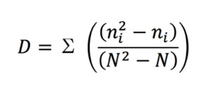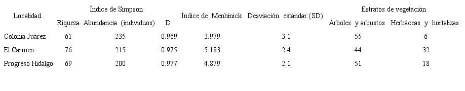 El índice de Simpson D contempla la probabilidad que en una muestra dos individuos seleccionados al azar pertenezcan a una misma especie. Este se usó para calcular la diversidad de especies en los huertos familiares en cada localidad.