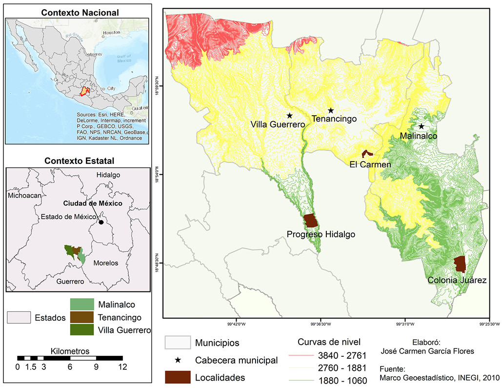 El área de estudio se sitúa en la zona de transición ecológica (ecotono) de las regiones biogeográficas Neártica y Neotropical (Juan, 2013), esta condición ambiental propicia la existencia de especies vegetales y animales de clima cálido y templado. El ecotono se localiza en el subtrópico del altiplano central mexicano, comprende 24 municipios ubicados en el sur del Estado de México. Las localidades estudiadas son Colonia Juárez, El Carmen y Progreso Hidalgo, ubicadas respectivamente al sur de las municipalidades de Malinalco, Tenancingo y Villa Guerrero. Al norte de los municipios se presenta la mayor altitud, ahí surgen las corrientes de agua que en su transcurso hacia el sur son utilizadas por los habitantes (Figura 1).