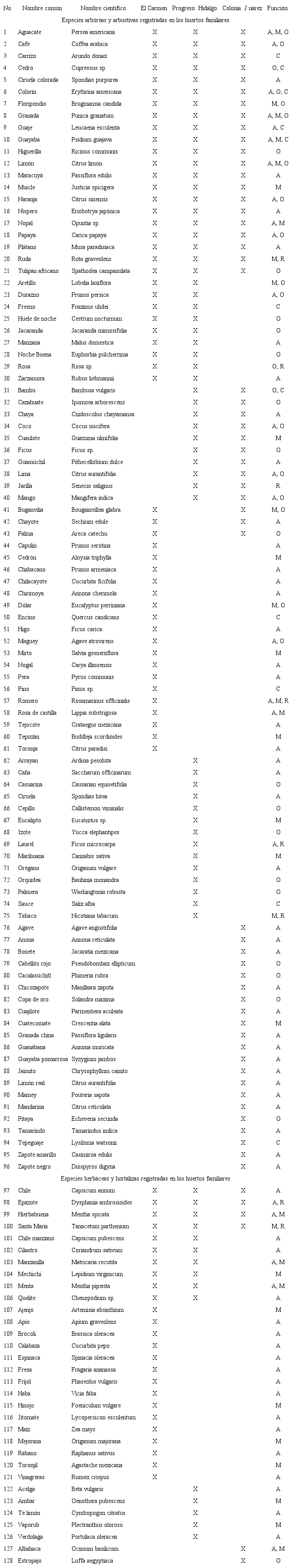 Las funciones de las especies fueron vinculadas con lo alimenticio, lo medicinal, lo ornamental, lo ritual-religioso y la construcción. El aprovechamiento de las especies es para: consumo de frutas (96 % de las familias) como mango, guayaba, limón, aguacate, durazno, mamey, lima e higo; uso de hojas (47 %) en la preparación de té de guayaba, limón, naranja, té limón o menta; condimentos para la comida (42 %) como epazote, tomillo, cilantro, hierbabuena o romero; también emplean plantas medicinales (31 %) algunas son ruda, sábila, manzanilla o mirto; o verduras (solo 13 % de las familias) que pueden ser rábano, lechuga, brócoli, jitomate o chile; otros productos son carne (23 %) y huevo (20 %).