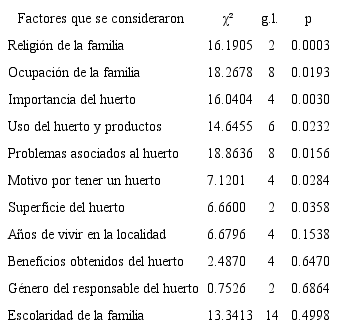 Con base en la prueba de χ², los factores sociales significativos fueron: 1. La religión de la familia, 2. La ocupación de las personas responsables del cuidado del huerto, 3. La importancia del agroecosistema para las familias, 4. El uso del huerto y productos obtenidos, 5. Los problemas asociados al huerto, 6. los motivos por tener un huerto, y 7. La superficie del huerto. No fueron significativos los años de vivir en la localidad, los beneficios obtenidos del huerto, el género del responsable del huerto y la escolaridad de la familia (Tabla 4). Se encontró que las familias campesinas relacionan la creencia religiosa con el manejo del huerto familiar, por ejemplo, el 29 de septiembre colocan una cruz de pericón (Tagetes lucida) como protección contra el demonio. También tienen la costumbre de utilizar un listón de color rojo, principalmente en plantas frondosas o con mucha producción, para evitar el daño causado por el mal de ojo, envidia o malas energías, esto les genera una sensación de seguridad. De esta manera se favorece la integración de la cosmovisión local, debido a que el mantenimiento del huerto familiar involucra aspectos culturales. Los factores socioculturales se reflejan en diversos beneficios sociales, ambientales y económicos para las familias.