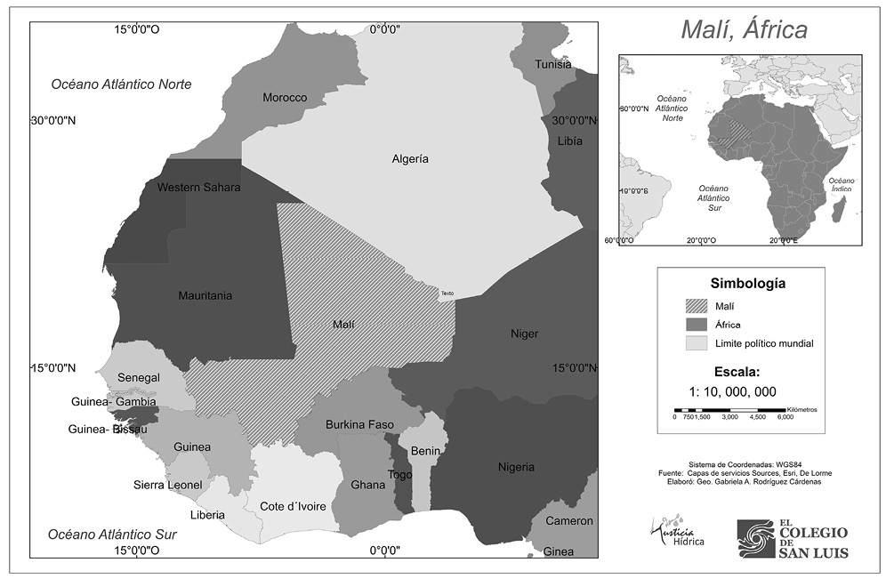 El clima del país varía de subtropical en el sur, a árido en el norte. La mayor parte del país presenta insignificantes precipitaciones (AITEC, 2013), por lo que las sequías son frecuentes. Desde finales de mayo a principios de octubre es la temporada de lluvias. Durante ese lapso de tiempo, las inundaciones del río Níger son comunes. Se ubica entre las latitudes N 17°0′0″ con O 4°0′0″ de longitud y una altitud sobre el nivel del mar de 1 440 metros (Figura 1). Es regado por los ríos Níger y el Senegal. En 2015, contaba con 17 599 694 de habitantes, que significó un incremento de 513 672 habitantes (251 498 mujeres y 262 174 hombres) con respecto a 2014. Asimismo, más del 80 % de la población obtiene sus ingresos del sector rural, ya que la mayoría reside en estas áreas (73.2 %), estimándose la tasa de urbanización en 26.8 %.4