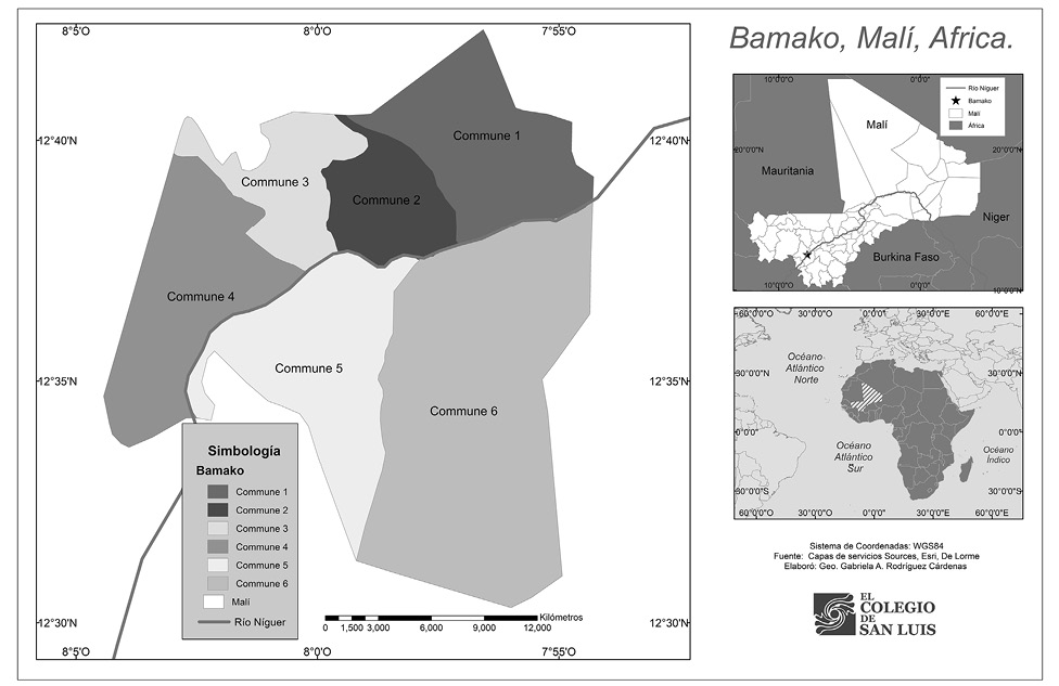 Bamako (río de caimanes), es la capital política y administrativa de la República de Mali. Se encuentra a orillas del río Níger y es divida por éste en dos partes (Figura 2). Tiene una superficie de unos 250 km2, que aumenta rápidamente con la urbanización. Está dividida en seis municipios y cuenta con una población total de aproximadamente 2 090 100 habitantes (Ministère de l’urbanization, 2014).