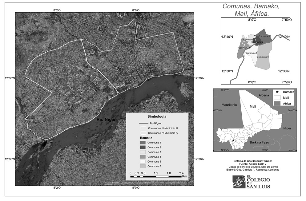 Los municipios III y IV del Distrito de Bamako (Figura 3), están situados en el lado izquierdo del río Níger, y tienen sus particularidades: el primero es céntrico y está conformado por las primeras colonias de la cuidad de Bamako, mientras que el otro es semiperiférico. El municipio III cubre alrededor de 23 km2, 27 % de la superficie de Bamako y tiene una población de 119 287 habitantes distribuidos en 20 colonias (Keita, 2009). Es uno de los municipios dotados de mejor infraestructura. El sector terciario (administración, comercio, servicios) es muy desarrollado y aquí laboran un número significativo de personas. Abarca el centro de la ciudad y tiene la particularidad de recibir casi un millón de personas al día (Doussou, 2009).