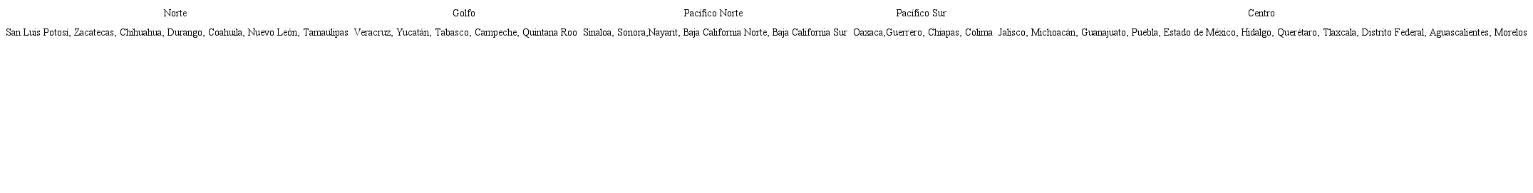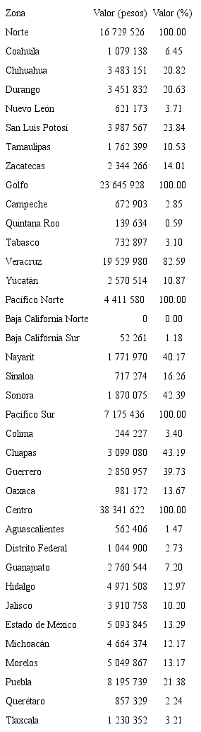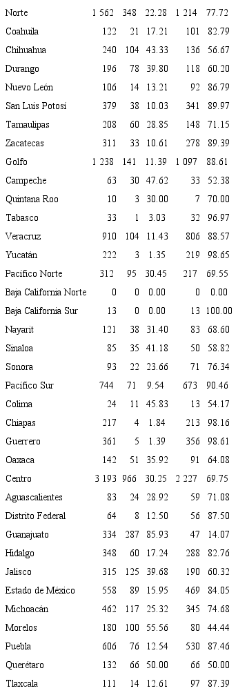 El Atlas estableció cinco zonas geográficas. Como se puede ver, el número de entidades por zona es muy desigual, lo que puede distorsionar las proporciones. La zona centro incluye once estados de los más poblados del país; situación muy diferente a la del Pacífico Sur integrada por sólo cuatro estados (Cuadro 1).