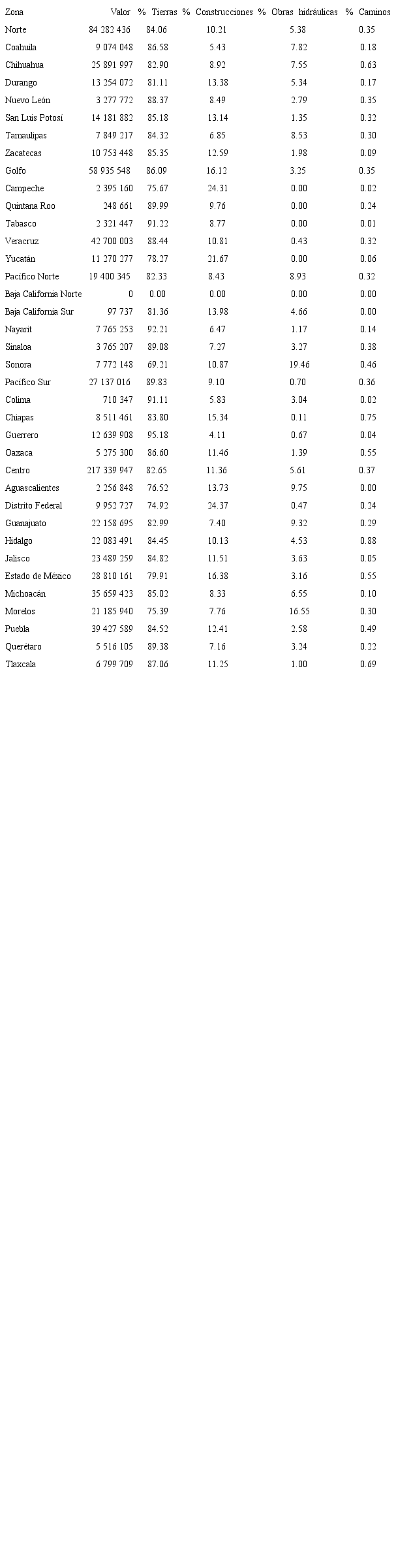 El siguiente rubro incluía las tierras, pero también se ponían en valor las construcciones, obras hidráulicas y caminos como factores que contribuían a mejorar las condiciones para el desarrollo de las actividades ejidales. Indudablemente, las tierras eran el mayor activo para los ejidatarios en todas las zonas del país. Muy por abajo, estaba el valor de las construcciones, las obras hidráulicas y los caminos. Sólo los estados de Sonora y Morelos se destacaban por el valor de sus obras hidráulicas: 19.46 % y 16.55 % respectivamente (Cuadro 9).