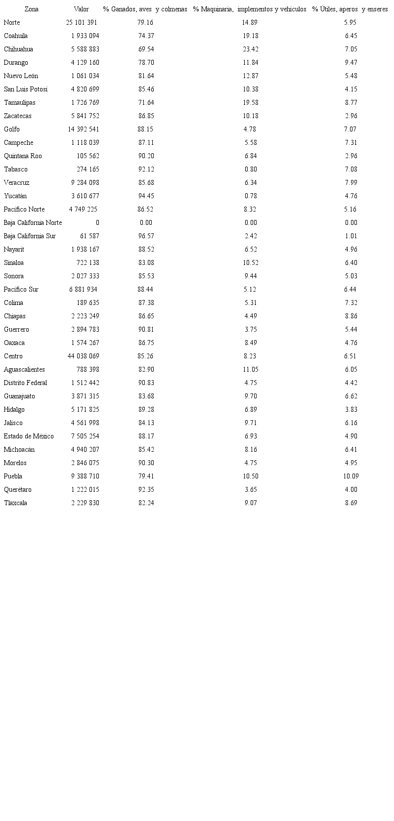 El siguiente rubro correspondía a los recursos propiamente de los ejidos y ejidatarios: ganados, aves y colmenas; maquinaria, implementos y vehículos; así como útiles, aperos y enseres. Lo más importante, además de la tierra, eran el ganado, las aves y las colmenas: 84.38 %, sin grandes diferencias por zonas. El único estado que se destacaba en cuanto a los valores de maquinaria, implementos y vehículos era Chihuahua con 23.42 %. Cabe señalar que los valores de los útiles, aperos y enseres era reducido en todo el país: 6.37 % (Cuadro 10).